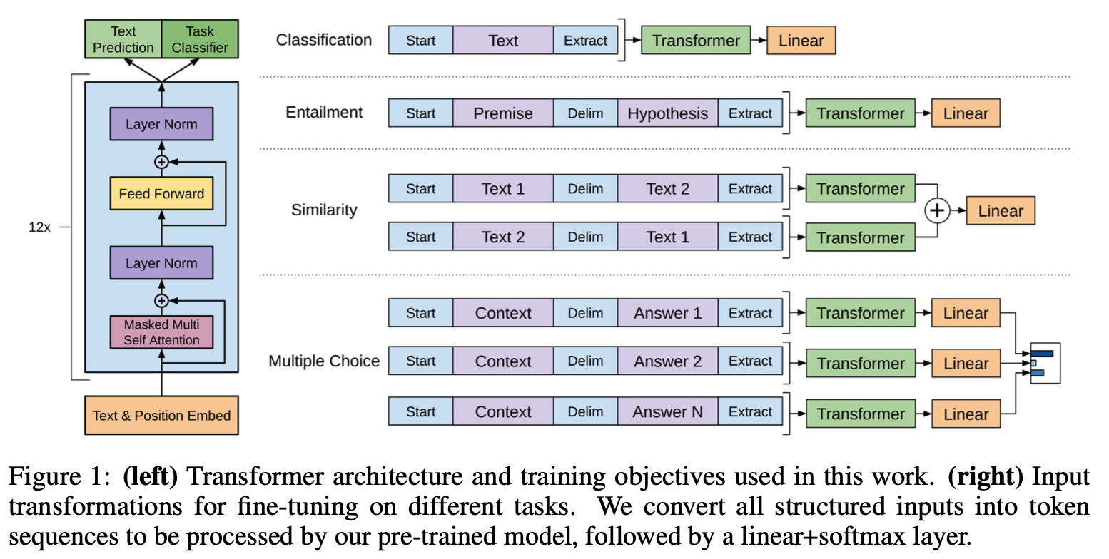 We use a traversal-style approach, where we convert structured inputs into an ordered sequence that our pre-trained architecture across tasks. All transformations include adding randomly initialized start and end tokens \((\langle s \rangle,\langle e \rangle)\).