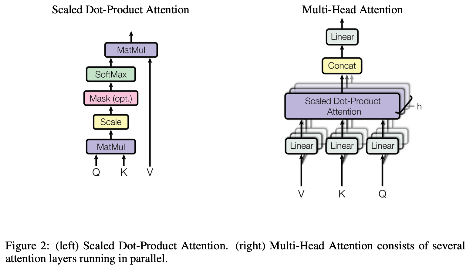 - Similarly, self-attention layers in the decoder allow each position in the decoder to attend to all positions in the decoder up to and including that position. We need to prevent leftward information flow in the decoder to preserve the auto-regerssive property. We implement this inside of scaled dot-product attention by masking out(setting to \(-\infty\)) all values in the input of the softmax which correspond to illegal connections.