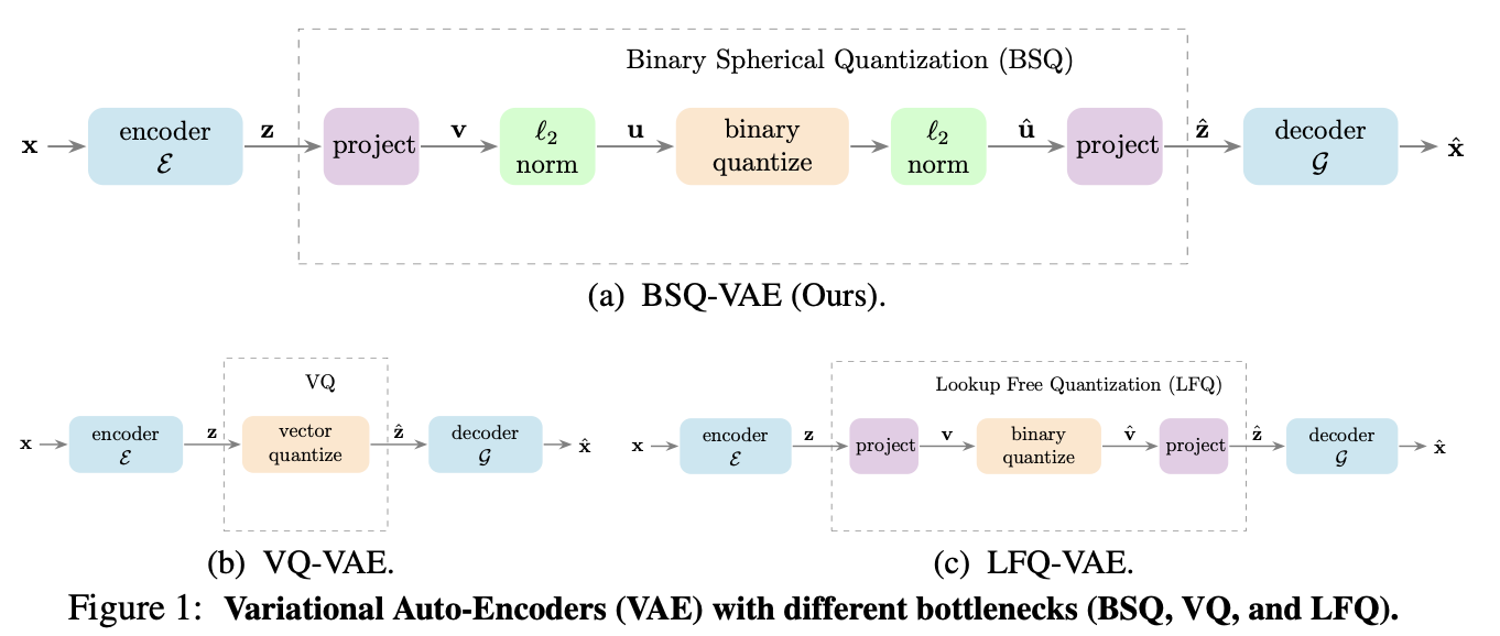 Binary Spherical Quantization (BSQ) optimizes over an implicit codebook \(\textbf{C}_{BSQ}=\{-\frac{1}{\sqrt{L}}, \frac{1}{\sqrt{L}}\}^L\), a hypercube projected onto a unit sphere. Each corner \(\textbf{c}_k \in \textbf{C}_{BSQ}\) of a hypercube corresponds to a unique token \(k\). The quantizer works as follows: it projects some high-dimensional latent embedding \(\textbf{z}\) to a lower-dimensional unit hypersphere \(\textbf{u}\), applies binary quantization per axis \(\hat{\textbf{u}}=sign(\textbf{u})\) and back-projects to the quantized vector in the original latent space \(\hat{\textbf{x}}\). Specifically, we start with an encoded visual input \(\textbf{z}=\mathcal{E}(\textbf{x}) \in \mathbb{R}^d\). We first linearly project the latent embedding to \(L\) dimensions \(\textbf{v} = Linear(\textbf{z}) \in \mathbb{R}^L\), where \(L \ll d\). Next, we obtain project \(\textbf{v}\) onto the unit sphere \(\textbf{u}=\frac{\textbf{v}}{|\textbf{v}|}\) and perform binary quantization to each dimension of \(u\) independently \(\hat{\textbf{u}}=\frac{1}{\sqrt{L}} sign(\textbf{\textbf{u}})\), where \(sign(x)\) is the sign function. To keep outputs on the unit sphere, we map \(sign(0) \rightarrow 1\). We use a Straight-Through Estimator (STE) make the operator differentiable, \(sign_{STE}(x) = sg(sign(x)−x) + x\), where \(sg(·)\) denotes the stop-gradient operation. Finally, we back-project the quantized \(\hat{\textbf{u}}\) to the \(d\)-dimensional space \(\hat{\textbf{z}} = Linear(\hat{\textbf{u}}) \in \mathbb{R}^d\).