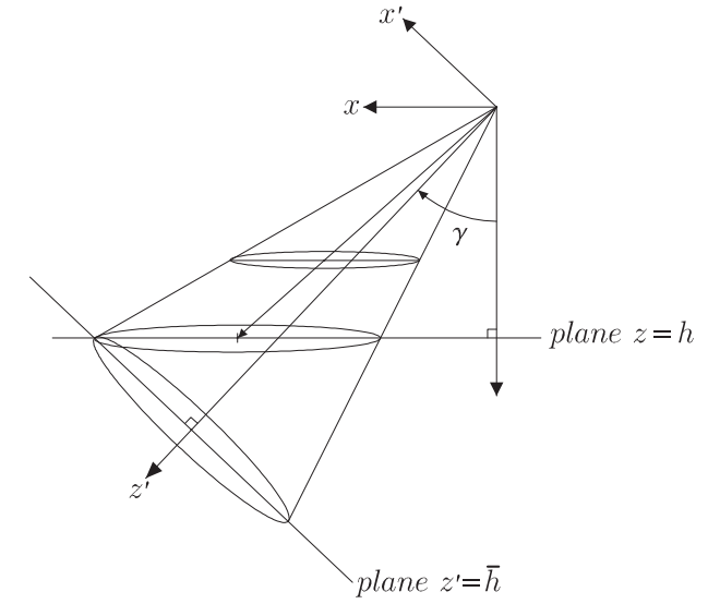 we need to rotate the coordinate system \((x,y,z)\) to \((x',y',z')\) where the \(z'\) axis lies along the center line of the right elliptic cone.