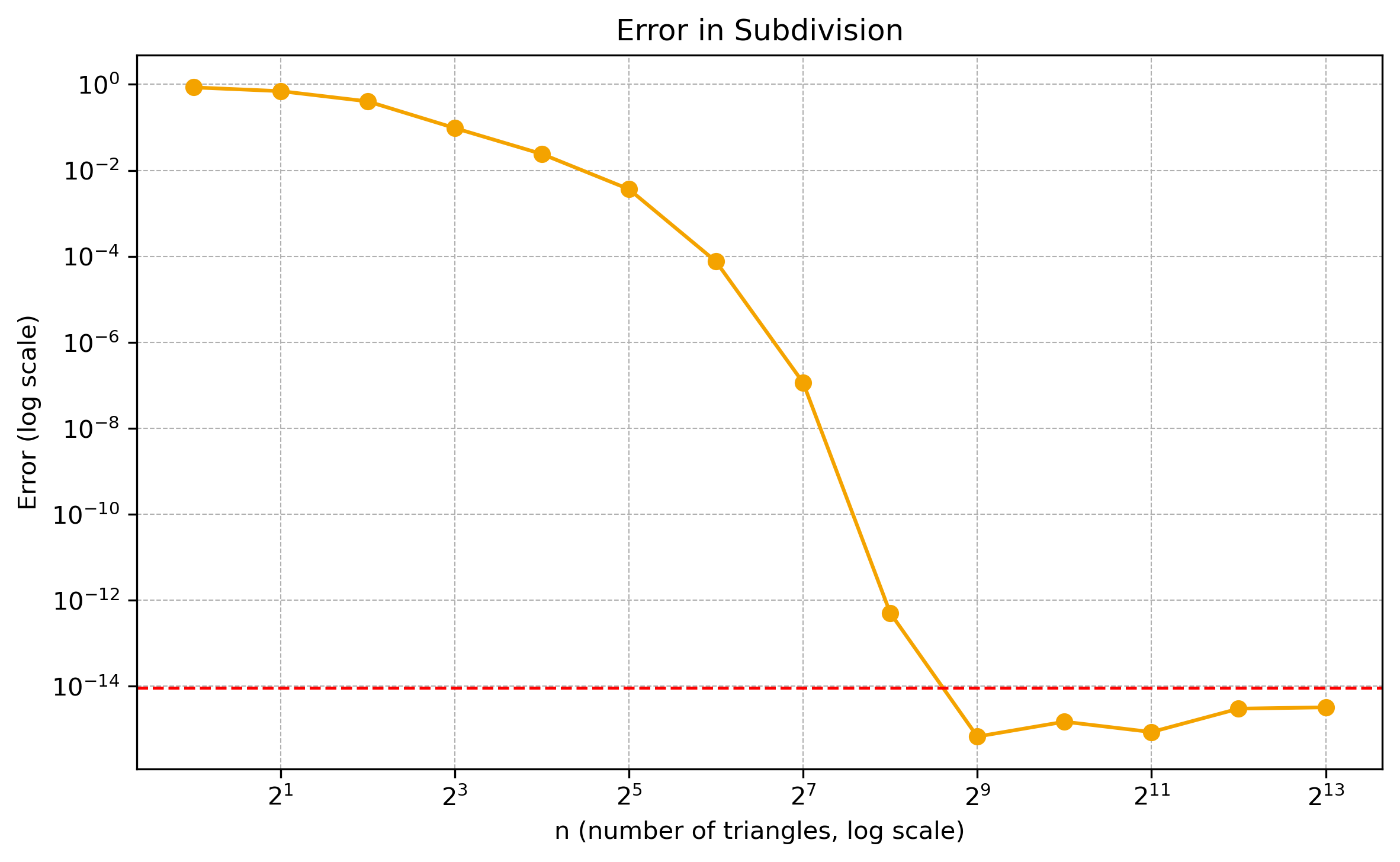 The error was determined by comparing our results with those reported in the paper, which are accurate to 20 significant digits The horizontal axis repersents the number of triangles used to divide the ellipse in the numerical intergration, while the vertical axis shows the average error in the calculated solid angle. The orange curve correspoinds to the numerical-integration approach, whereas the red dahed line denotes the analytical formula(\(9.20974e-15\)).