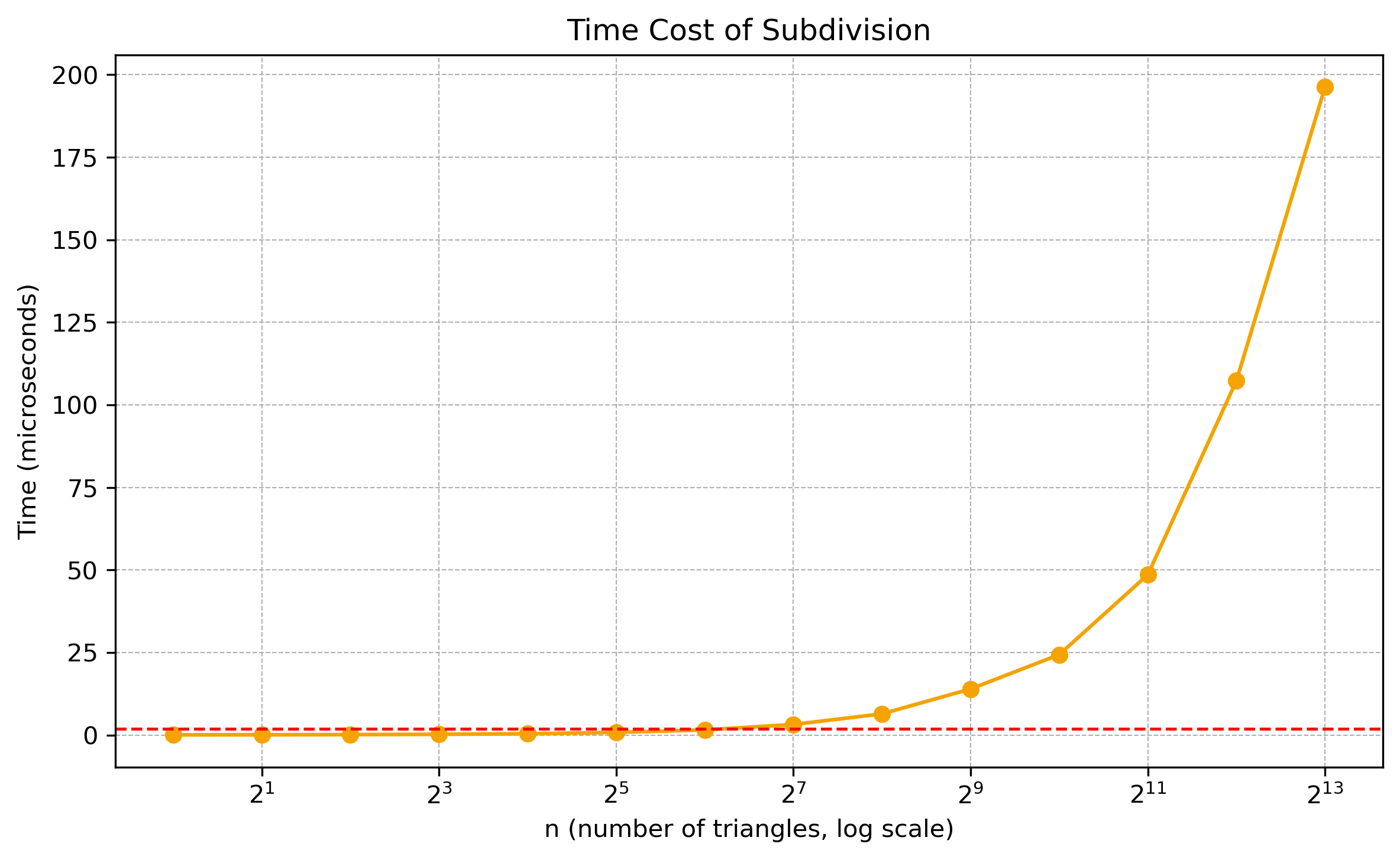 The horizontal axis repersents the number of triangles used to divide the ellipse in the numerical intergration, while the vertical axis shows the average time required to compute the solid angle. The orange curve correspoinds to the numerical-integration approach, whereas the red dashed line denotes the analytical formula(\(1.9123\mu s\)).